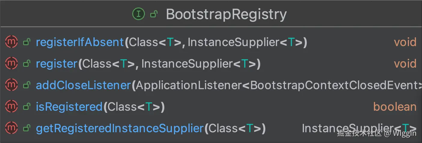 显然,这个接口的主要作用就是用于初始化BootstrapRegistry,也就是最终是要通过操作BootstrapRegistry来达到相应的目的。那么BootstrapRegistry才是重点。所以我们继续看看BootstrapRegistry接口。因为BootstrapRegistry注释较多,所以我自己简单翻译下(tips:注释最好还是自己看一下,每个人的理解不同,翻译出来的可能也不同),其中一些比较核心的也均通过颜色标注
