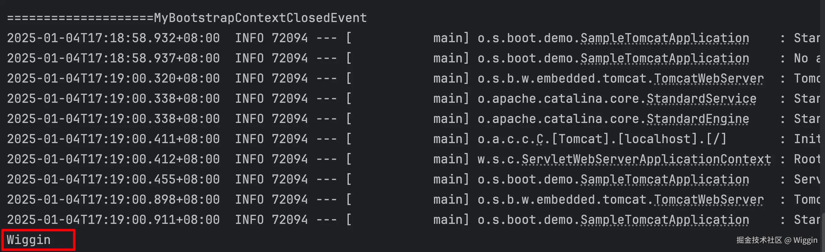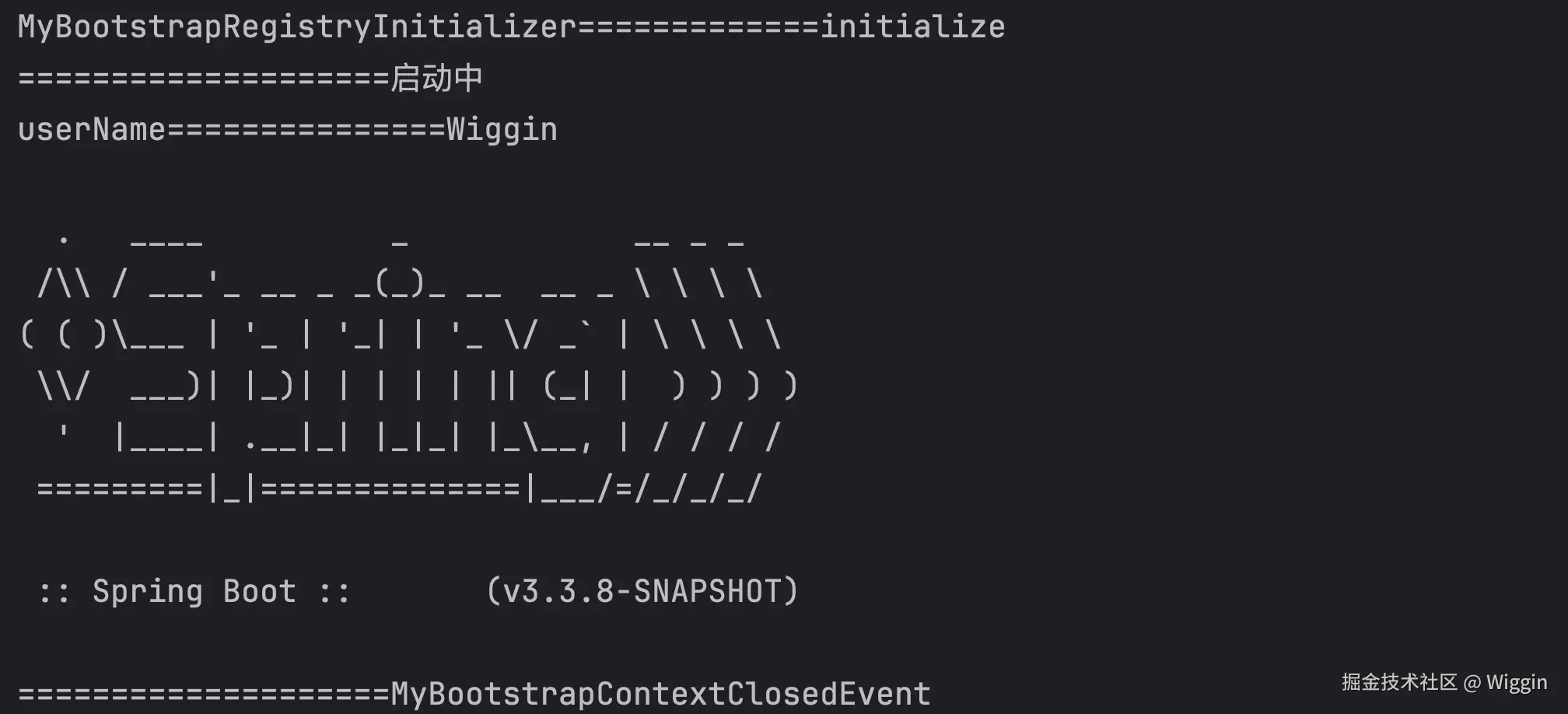可以看到打印完banner之后,触发了MyBootstrapContextClosedEvent(这里的触发顺序对我们后面理解源码很有帮助)