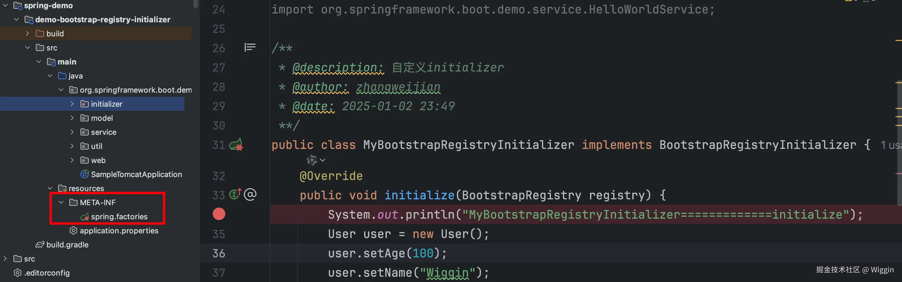 之前看代码的时候,我们已经了解过springboot是怎么去加载BootstrapRegistryInitializer的了,所以我们只要照葫芦画瓢,在项目中新建spring.factories即可