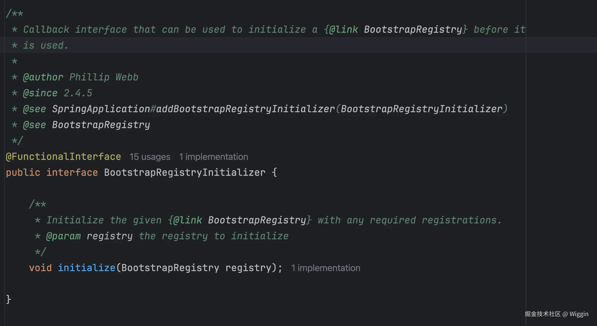 看完注释,我们大概能知道个一二:BootstrapRegistryInitializer用于往BootstrapRegistry注册一些创建成本比较高或在ApplicationContext准备好之前要用到的实例(这里如果后面阅读完整个启动流程,可能会更好理解,后面阅读的时候也可以想想为什么springboot要这么设计)。