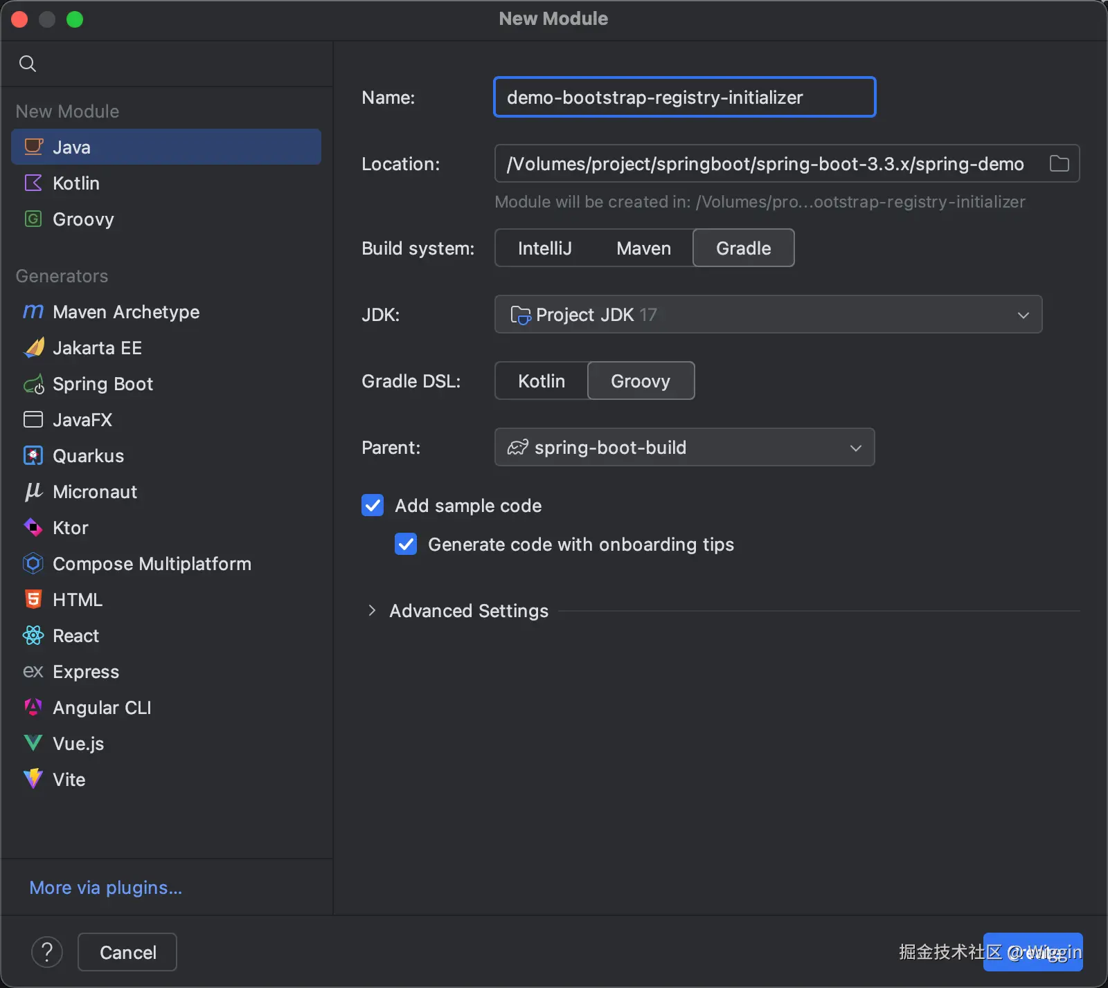 将新建模块的目录下删除感觉,然后用同样的方法再建一个子模块,demo-bootstrap-registry-initializer,