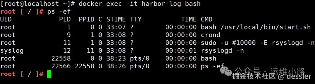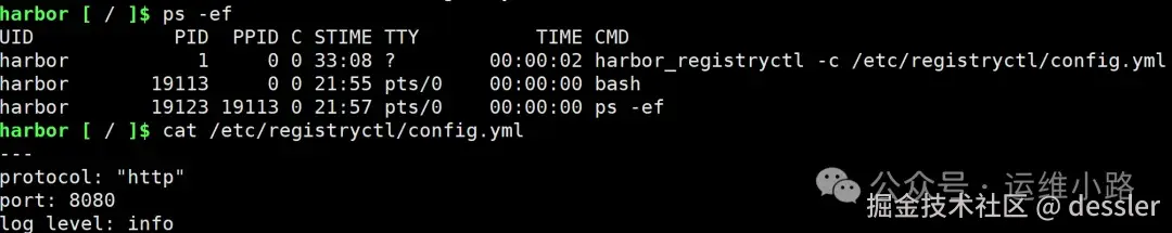 用途:用于集中收集和管理 Harbor 系统中的日志信息。它可以接收来自 Harbor 其他组件(如registry-photon、harbor-core等)的日志数据,并进行统一的存储、处理和分析。可以理解这个容器是把其他所有容器的日志进行收集,容器里面只有一个rsyslogd。