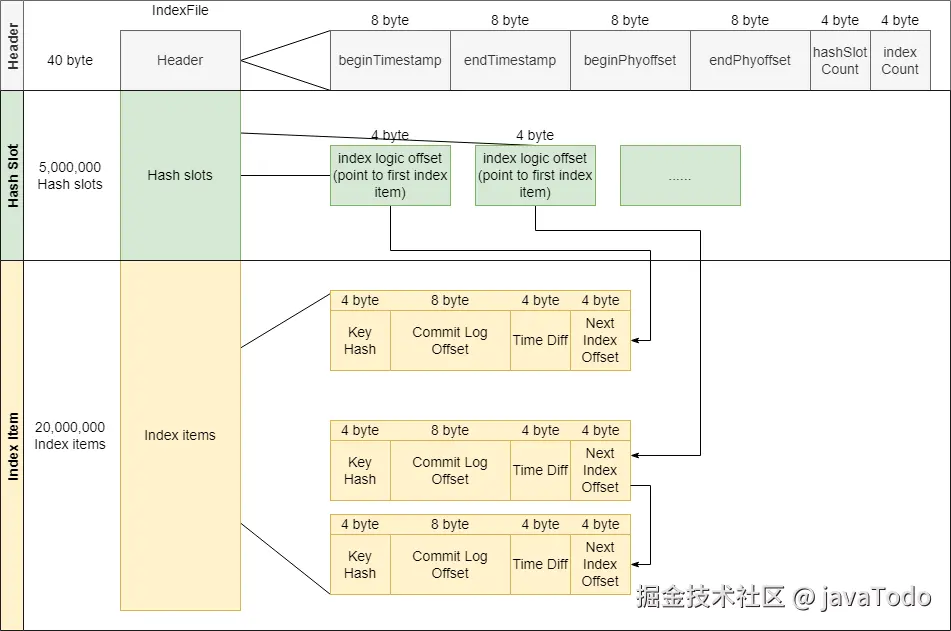 maxHashSlotNum来配置)- 存储的每个值是在索引文件中 索引的逻辑下标。因为索引文件的 Header 和 Hash Slot 部分长度都是固定的,每个索引的长度也是固定的,所以可以通过逻辑下标计算出索引项在索引文件中的绝对偏移量