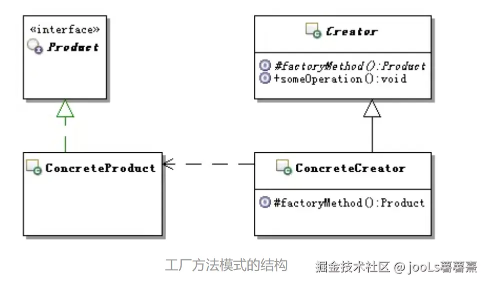 Product类型的实例对象,而且多是抽象方法。也可以在Creator里面提供工厂方法的默认实现,让工厂方法返回一个缺省的Product- ConcreteCreator: 具体的创建器对象,覆盖实现