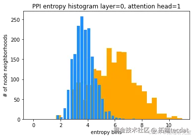 其核心思想如下:假设有一个“假设性的”GAT 模型,它对每个节点的邻域具有恒定的注意力(即所有分布是均匀的),我们计算每个邻域的熵,并根据这些熵值绘制直方图。然后将其与我们训练得到的 GAT 模型的直方图进行比较,观察两者的差异。如果两个直方图完全重叠,意味着我们的 GAT 模型具有均匀的注意力模式;重叠越小,则分布越不均匀。在此,我们关注的并非信息本身,而是直方图的匹配程度。这有助于清晰地了解 GAT 模型学习到的注意力模式是否有意义。若 GAT 学习到的是恒定注意力,那么使用 GCN 或更简单的模型可能就足够了。
