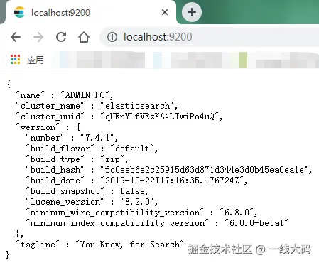 在浏览器输入http://localhost:9200/,看到下面内容表示安装启动成功。