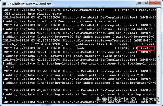 执行的时候在命令行窗口看到下面日志,表示Elasticsearch已经安装启动完毕。