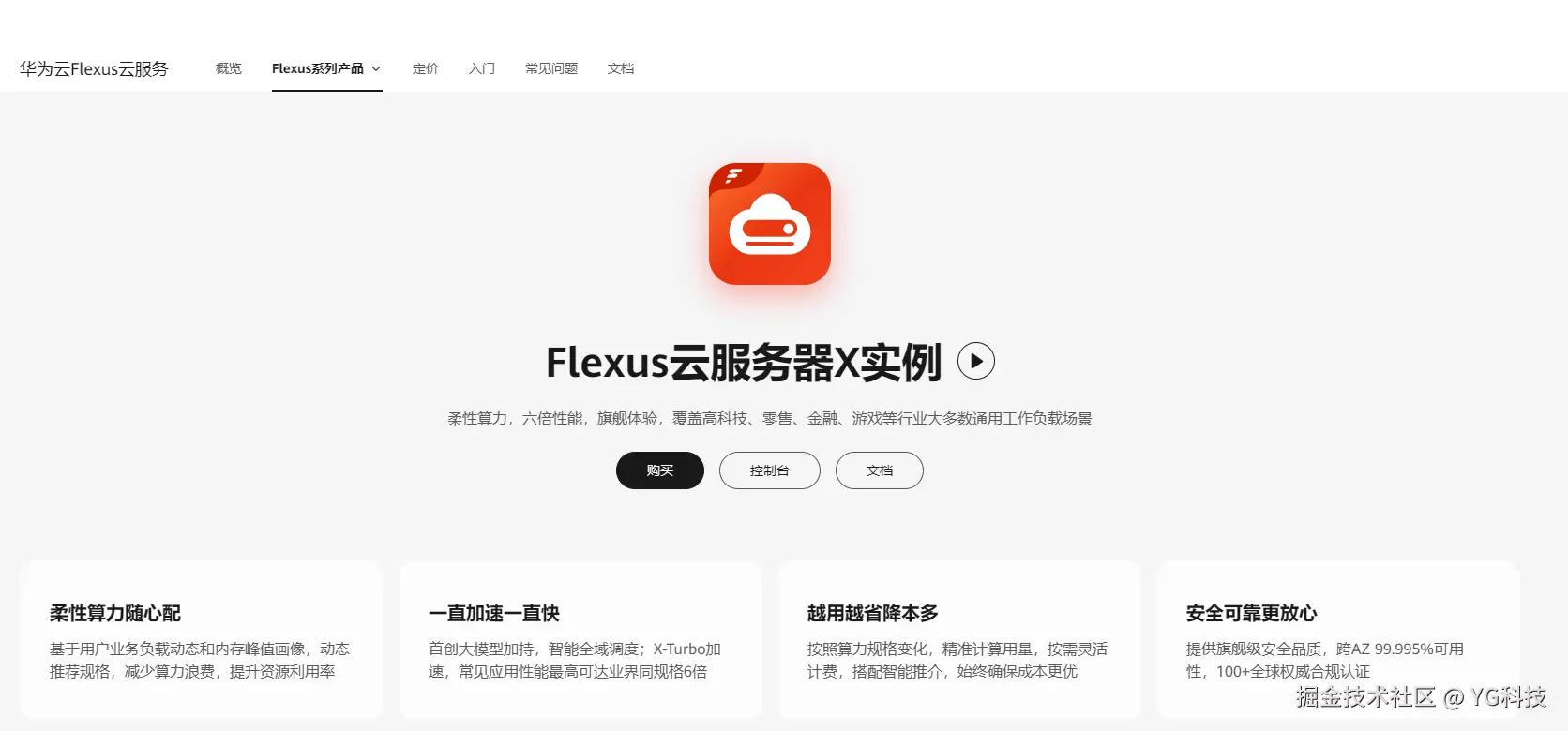 踏上申请之路:首先,打开华为云首页,那醒目的华为云 Flexus 云服务海报犹如璀璨星辰般吸引着目光。点击“了解详情”,便进入了 Flexus 云服务产品介绍页面。接着,来到申请页面:www.huaweicloud.com/product/fle…,点击“购买”,就此开启一段充满挑战的冒险之旅,迈入 X 实例配置环节。