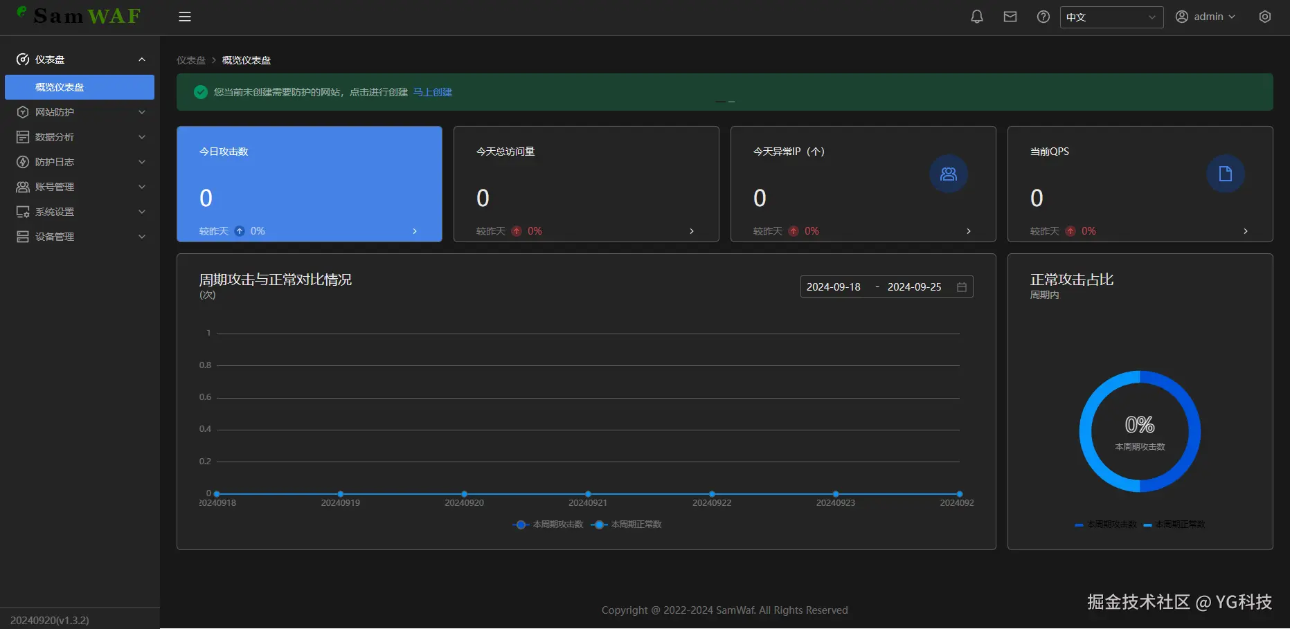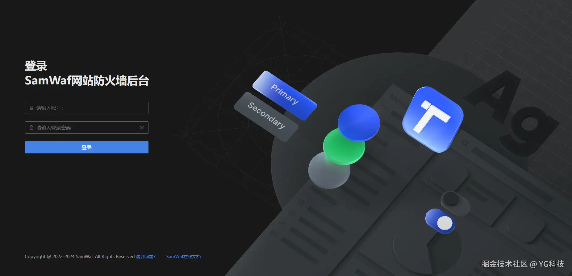 输入默认账号 admin,密码 admin868 即可进入 SamWaf 防火墙啦!