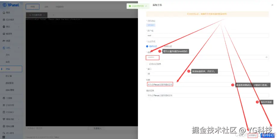 在主机的终端管理中,我们填写主机的相关连接信息,包括主机的登录账号密码、端口等,此处我们填写 root 密码即可,其余默认。