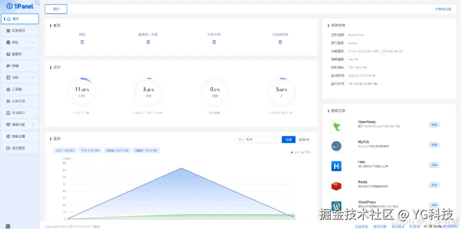 在此页面上,我们可以全面查看服务器的整体状况,包括网站、数据库、计划任务及已安装应用的数量统计;同时,还可以监控 Linux 服务器的关键系统信息,如 CPU 和内存使用情况、磁盘状态、磁盘 I/O 活动以及网卡流量的实时数据。