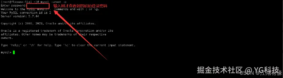 [root@flexusx-51a1 ~]# mysql -uroot -pEnter password:Welcome to the MySQL monitor. Commands end with ; or \g.Your MySQL connection id is 2Server version: 5.7.44Copyright (c) 2000, 2023, Oracle and/or its affiliates.Oracle is a registered trademark of Oracle Corporation and/or itsaffiliates. Other names may be trademarks of their respectiveowners.Type 'help;' or '\h' for help. Type '\c' to clear the current input statement.mysql>