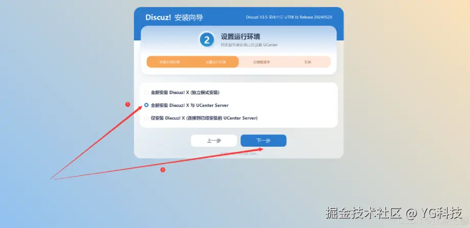 选择默认的“全新安装 Discuz! X 与 UCenter Server”方式,选择“下一步”。