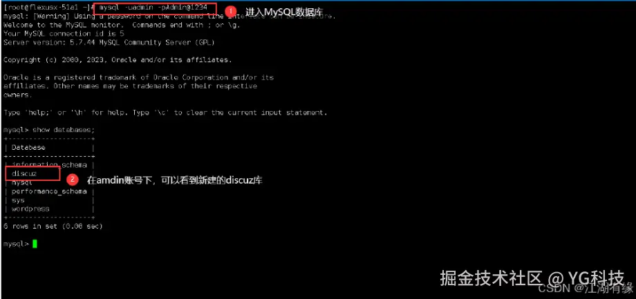 [root@flexusx-51a1 ~]# mysql -uadmin -pAdmin@1234mysql: [Warning] Using a password on the command line interface can be insecure.Welcome to the MySQL monitor. Commands end with ; or \g.Your MySQL connection id is 5Server version: 5.7.44 MySQL Community Server (GPL)Copyright (c) 2000, 2023, Oracle and/or its affiliates.Oracle is a registered trademark of Oracle Corporation and/or itsaffiliates. Other names may be trademarks of their respectiveowners.Type 'help;' or '\h' for help. Type '\c' to clear the current input statement.mysql> show databases;+--------------------+| Database |+--------------------+| information_schema || discuz || mysql || performance_schema || sys || wordpress |+--------------------+6 rows in set (0.00 sec)mysql>