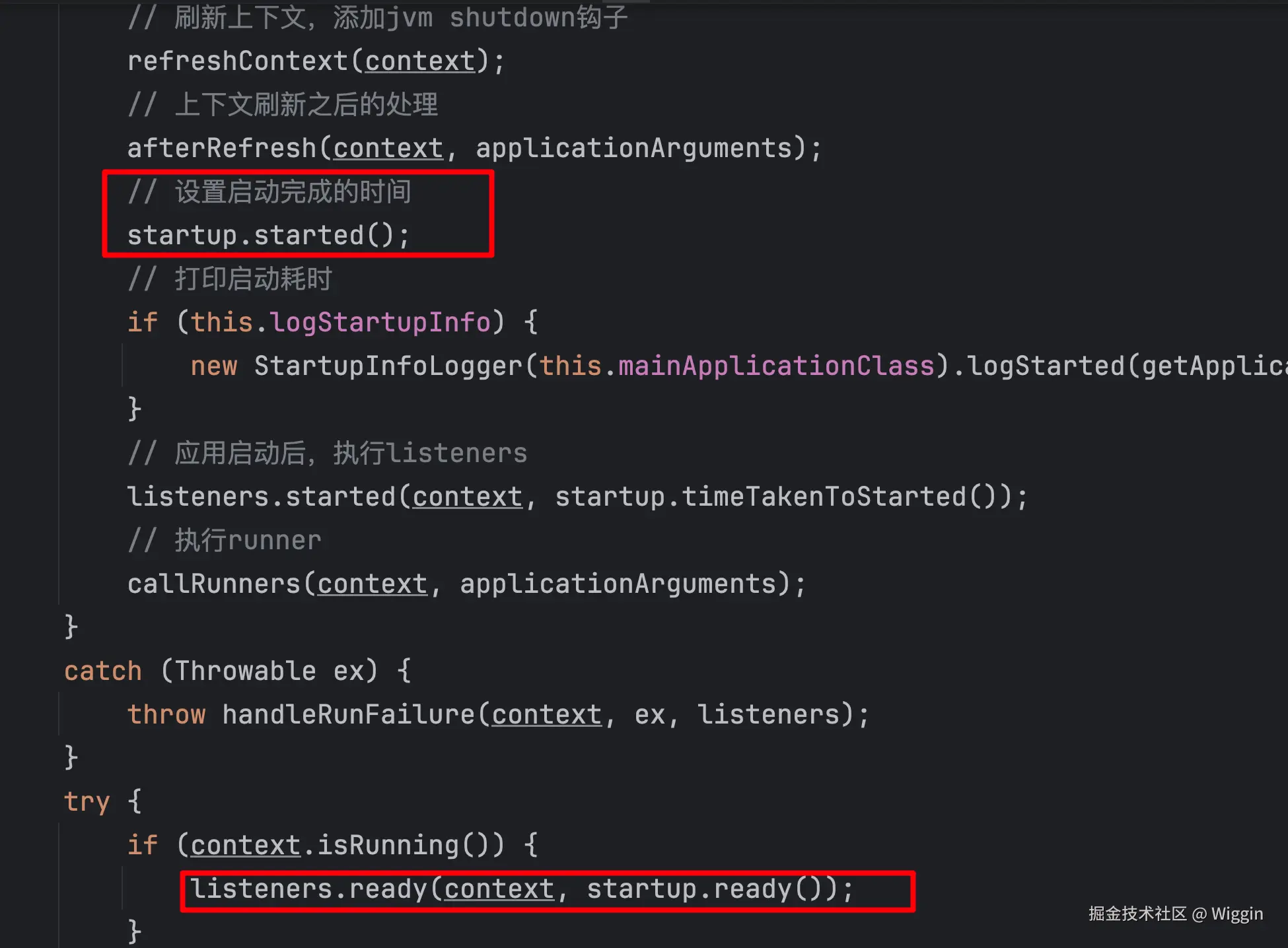 我们可以看到,run方法调用后,会执行很多操作,直到刷新上下文、以及刷新上下文后的后置处理完成之后,才会认为项目已经启动完成。之后,记录日志,再执行应用启动完的listener、再执行runner,等到都执行完成了,才会认为springboot进入ready状态。这几个时机,在我们日常开发的去自定义listener、runner非常有用。