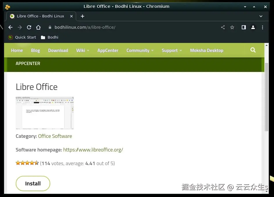 Bodhi Appcenter(见图 2)使用 Chromium 打开一个网站,允许您安装应用程序,例如 LibreOffice。在网站上找到您要安装的应用程序,然后单击关联的“安装”按钮。但是,这时出现了第一个问题。当我尝试从 Appcenter 安装 LibreOffice 时,我收到一个错误,提示它找不到“libreoffice”包。