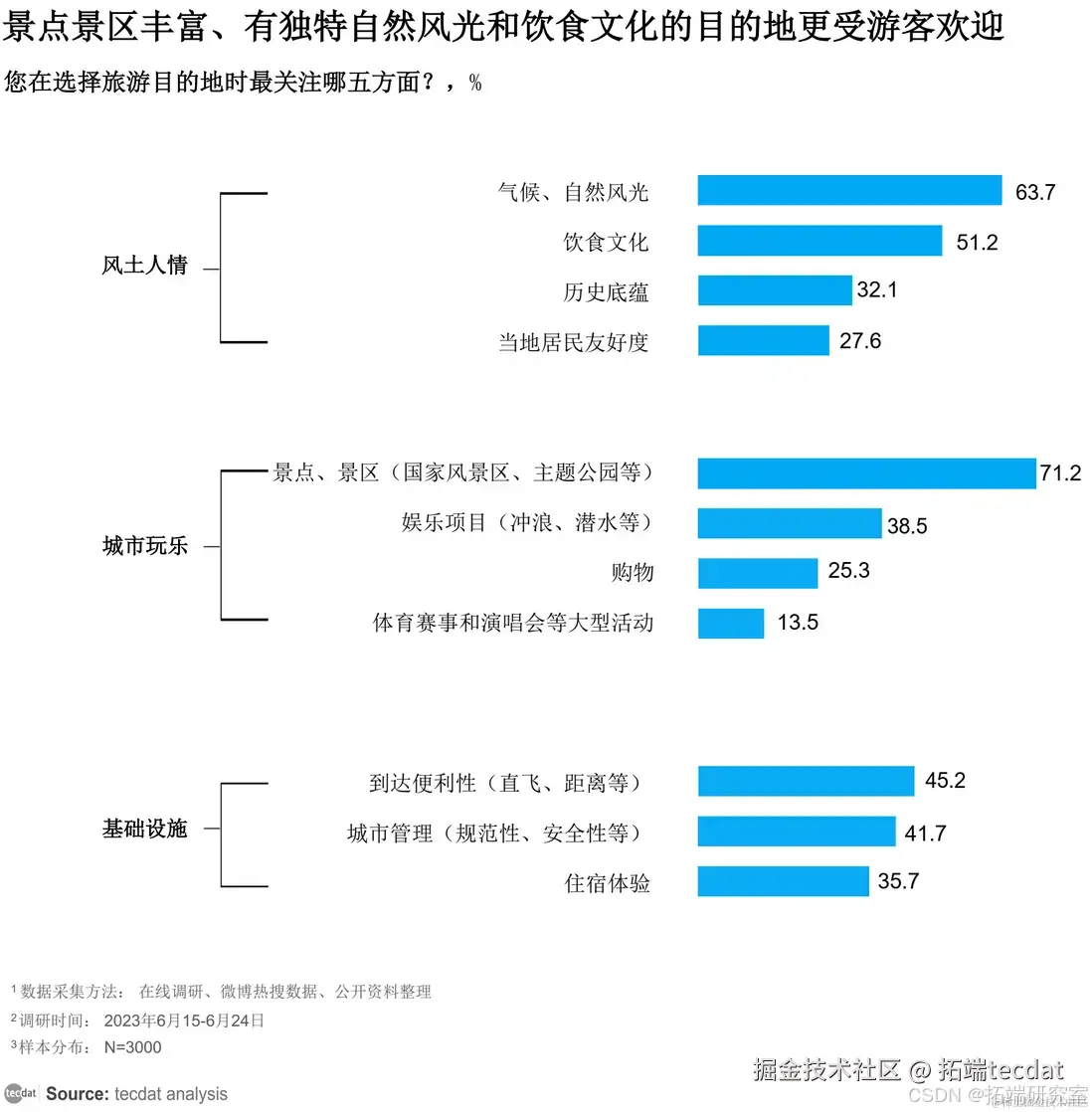 对体验的渴望重塑旅游需求。如今旅行决策多基于特定活动兴趣,体验优先于目的地选择。拥有丰富景点、独特风光与饮食文化的目的地更受欢迎,因其能提供多样体验。在旅游各方面,高铁 / 动车和飞机是出行首选;住宿以经济型酒店等为主;娱乐方面景点安全性等受认可但软性能力待提升;餐饮注重特色美食。近期调查显示,当地活动选择与质量是旅行者选择目的地的重要因素,体验当地习俗文化也常被提及。