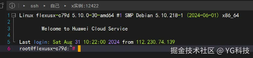我们首先通过 ssh 连接上华为云 Flexus X 实例云服务器。