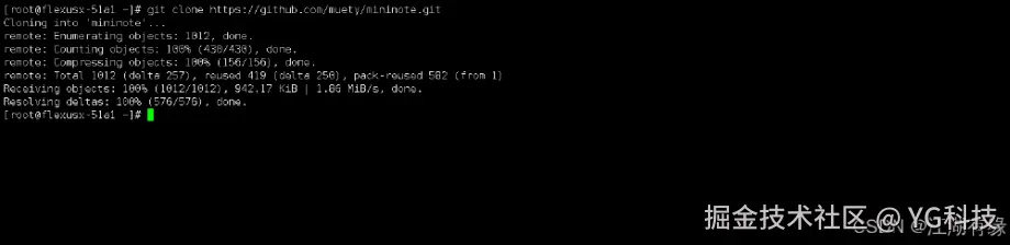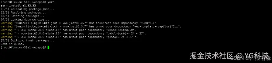 [root@flexusx-51a1 mininote]# yarnyarn install v1.22.22[1/5] Validating package.json...[2/5] Resolving packages...[3/5] Fetching packages...[4/5] Linking dependencies...[5/5] Building fresh packages...Done in 0.35s.
