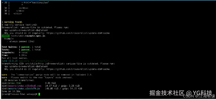 [root@flexusx-51a1 mininote]# cd webapp/[root@flexusx-51a1 webapp]# lsbabel.config.js index.html package.json public static tests vue.config.jscaddy jest.config.js postcss.config.js src tailwind.config.js vite.config.js yarn.lock