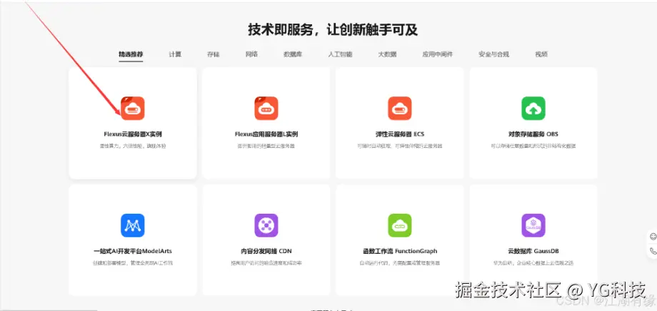 我们在华为云官网首页,精选推荐模块中,可以看到 Flexus 云服务器 X 实例,点击进入 Flexus 云服务器 X 实例主页。
