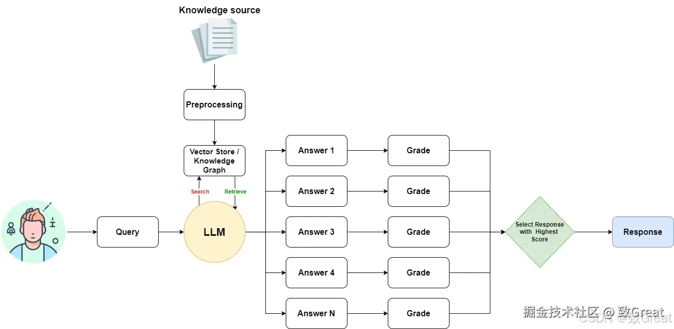 - 评分:评分机制根据相关性、连贯性、完整性和事实准确性等标准对每个答案进行评估和打分。这可能涉及将答案与更多检索到的文档进行比较或使用评分模型。与校正RAG类似,此步骤取决于项目目标和领域。