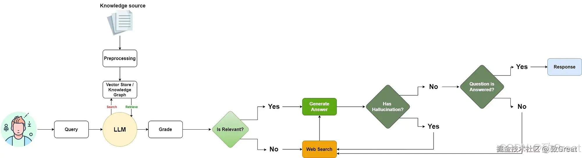 - 评分:为了对文档进行评分或反思,LLM会对每个答案进行批评,判断其是否与查询相关。如果文档不相关,则使用外部来源;如果相关,则检查是否存在幻觉和准确性。