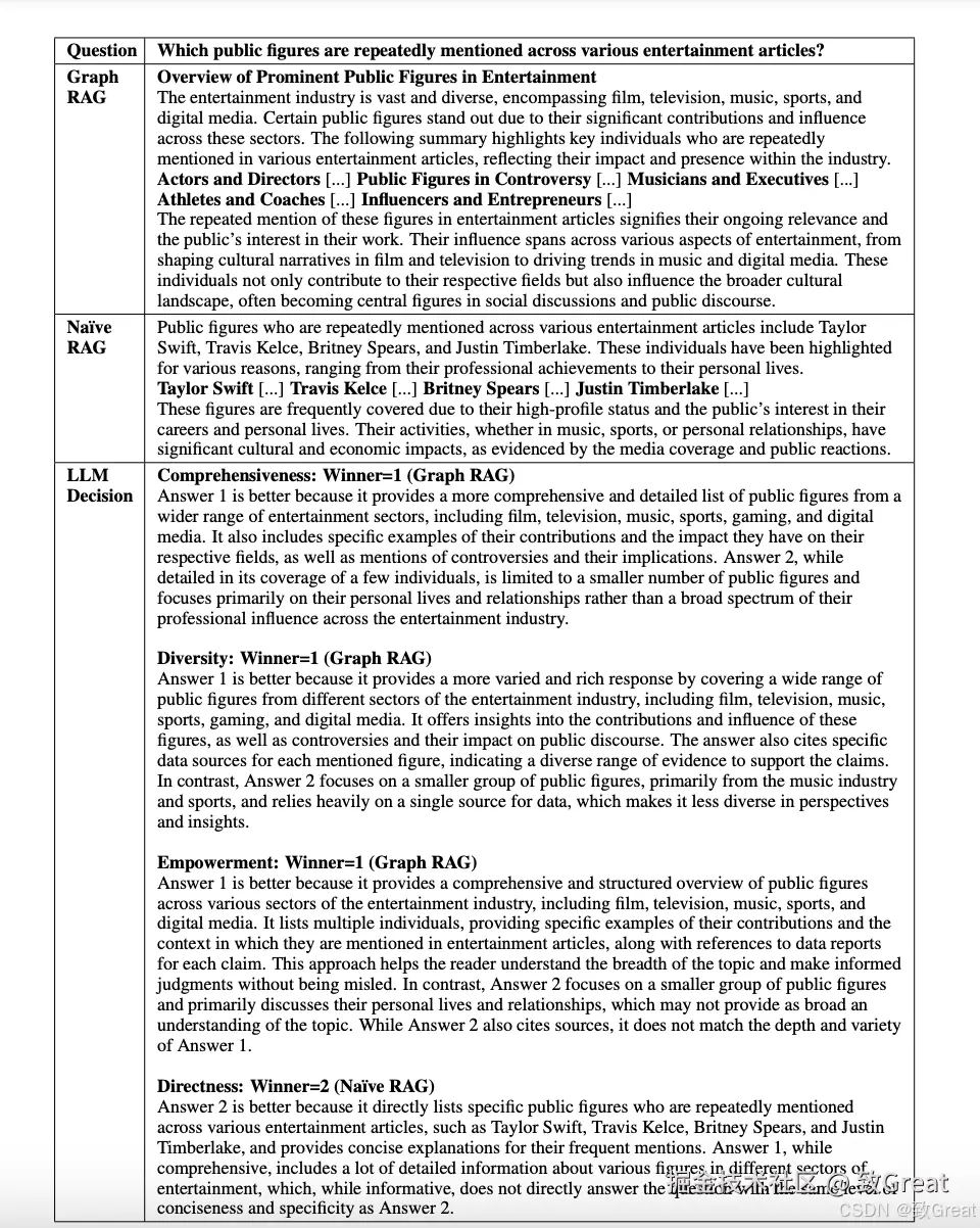 示例 针对新闻文章数据集的示例问题,Graph RAG(C2)和基础 RAG 的表现显示,GraphRAG 在处理复杂查询任务上具有显著优势,尤其是在需要全局理解和高层语义分析的场景中。