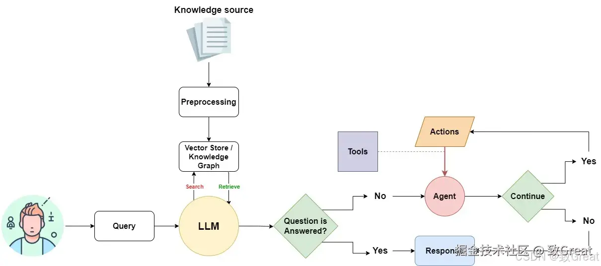- 代理干预与行动:如果初始答案未能充分回答查询,模型通过代理采取行动。代理可能会执行额外的任务,例如使用外部工具或调用进一步的操作以收集更多相关信息。LLM自主决定检索哪些信息以及采取哪些行动以实现目标。这可以通过在该步骤中为LLM定义一个思维链提示来完成。