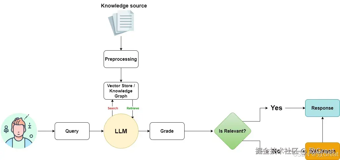 - 搜索与检索:模型访问知识库或数据库,该数据库经过预处理阶段以高效地构建信息以供后续使用。预处理后的数据存储在向量存储库或知识图谱中,以便于检索。