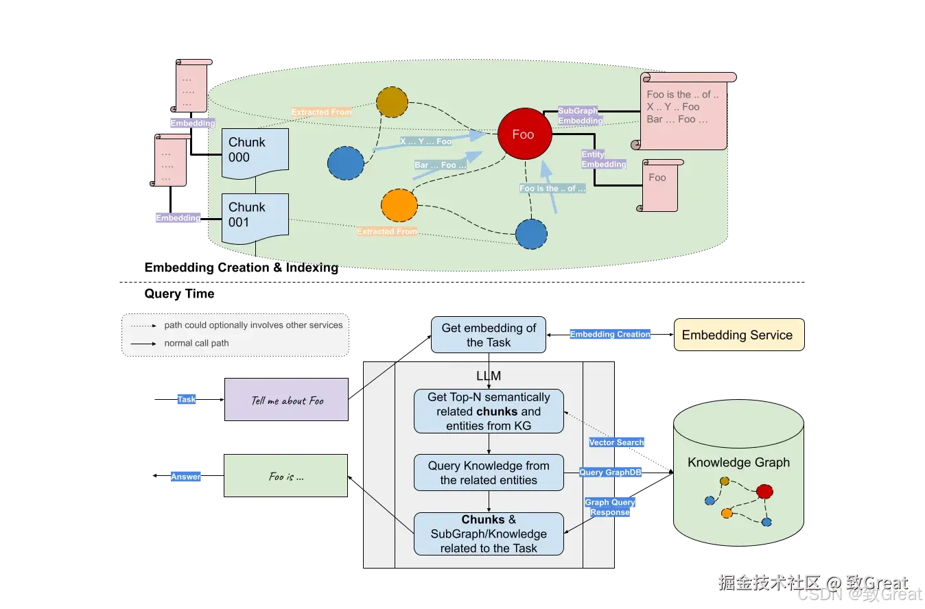 GraphRAG 的成功也催生了一系列轻量级的优化版本,诸如 LightRAG 与 nano-GraphRAG 等。与此同时,还涌现出了一些别具一格的变体,如 KAG 框架。这些框架在传统 RAG 框架的基础上,进一步强化了实体、社区以及文本切块(Chunking)之间的内在联系,并且巧妙地将现有知识图谱(KG)中的知识融入其中。这一系列的改进措施,显著提升了信息检索的召回率与准确性,为用户带来了更为优质的信息检索体验。
