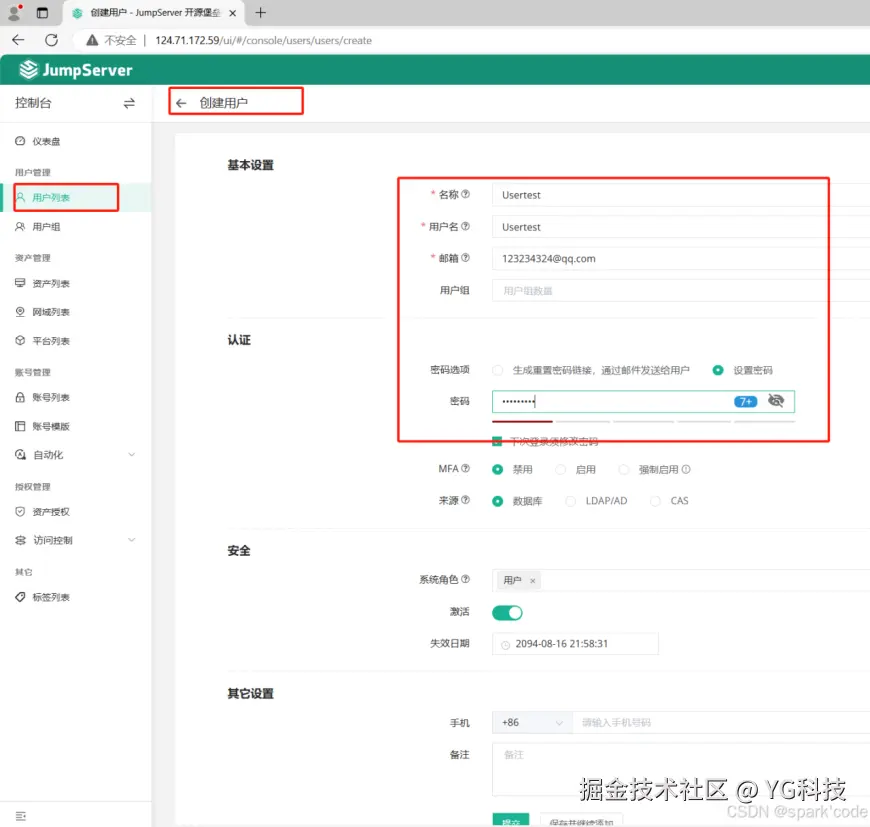 在用户管理-用户列表中创建用户,填写好基本信息和密码。