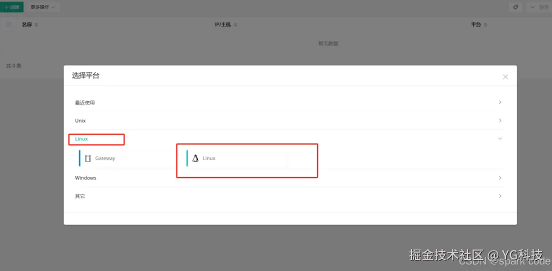 先选择平台类型,然后在选择子类型,这次我们用 linux 当作 ssh 的主机。