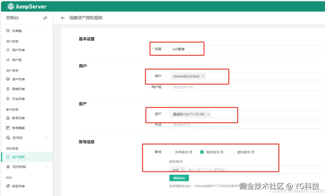 在授权管理中的资产授权将创建好的 ssh 资源授权给 Usertest 用户。