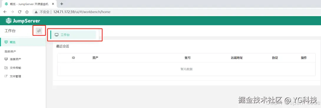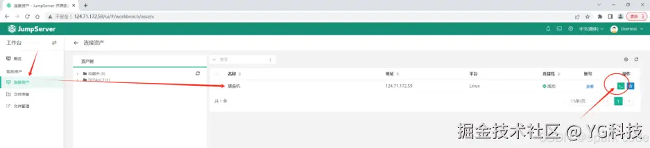 登陆成功之后切到工作台。在连接资产中就能看到添加的 ssh 资产了。