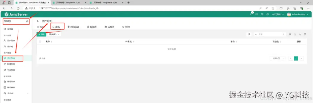 在控制台中资产列表,选择主机,点击创建资产。