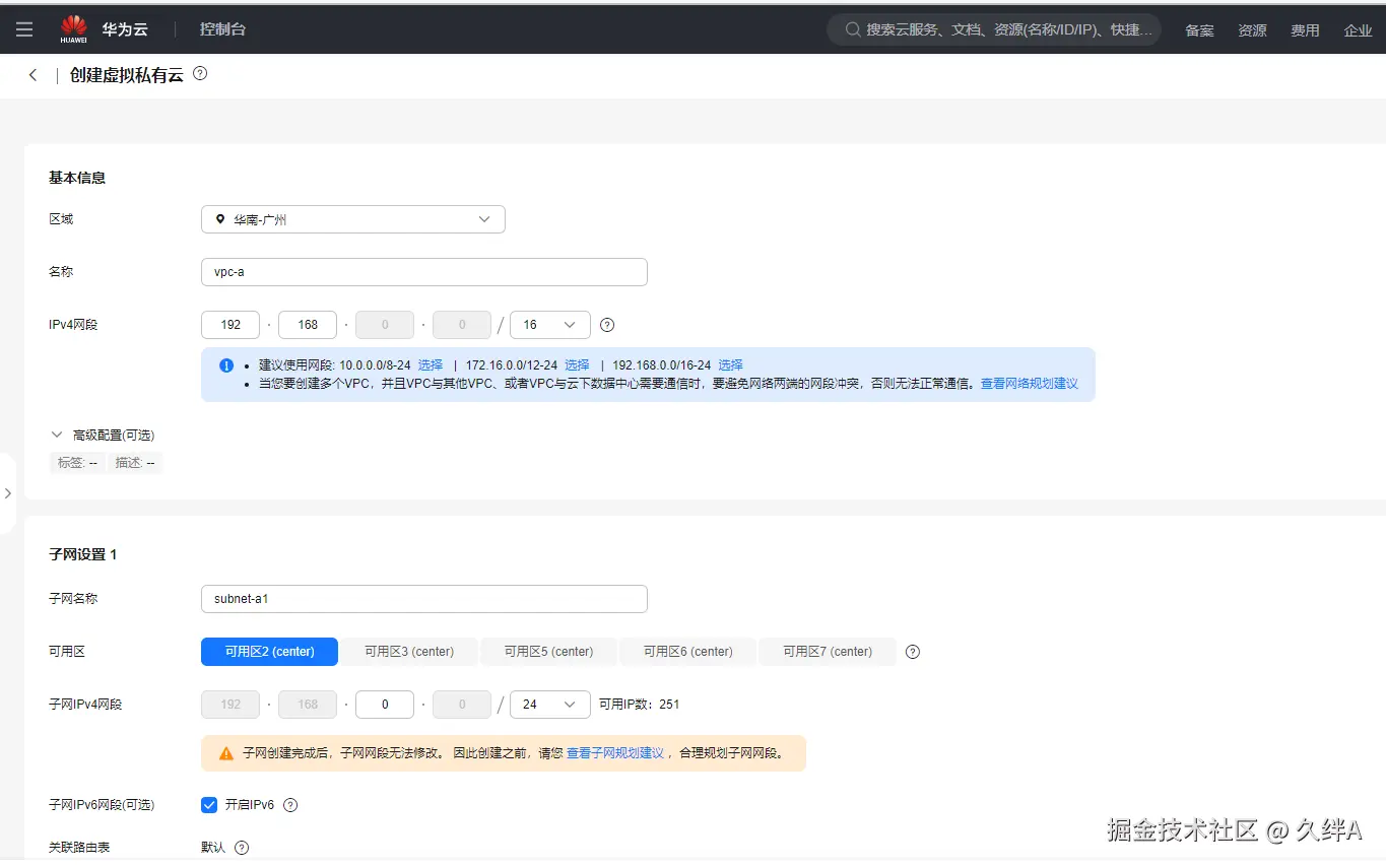 - 在“创建虚拟私有云”页面,根据界面提示配置VPC的参数: