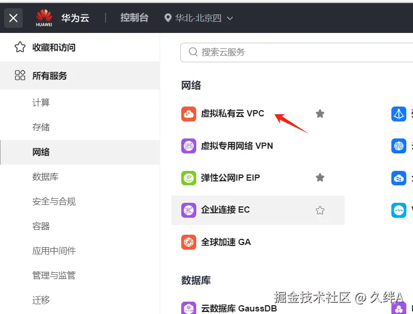 进入虚拟私有云页面:在页面左上角单击图标,打开服务列表,选择“网络 > 虚拟私有云”。