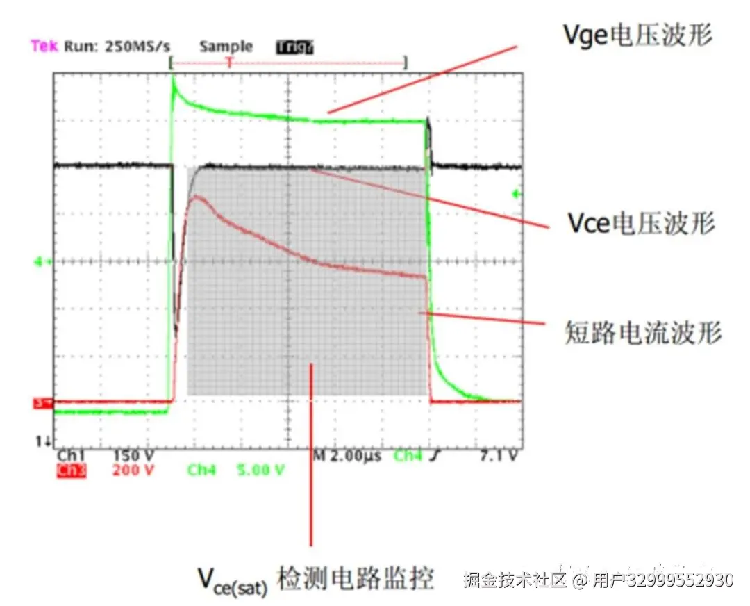 正常工作时,IGBT的集电极-发射极电压非常低(典型值为1 V至4 V)。然而,如果发生短路事件,IGBT集电极电流上升到驱动IGBT退出饱和区并进入线性工作区的电平。这会导致集电极-发射极电压快速升高。