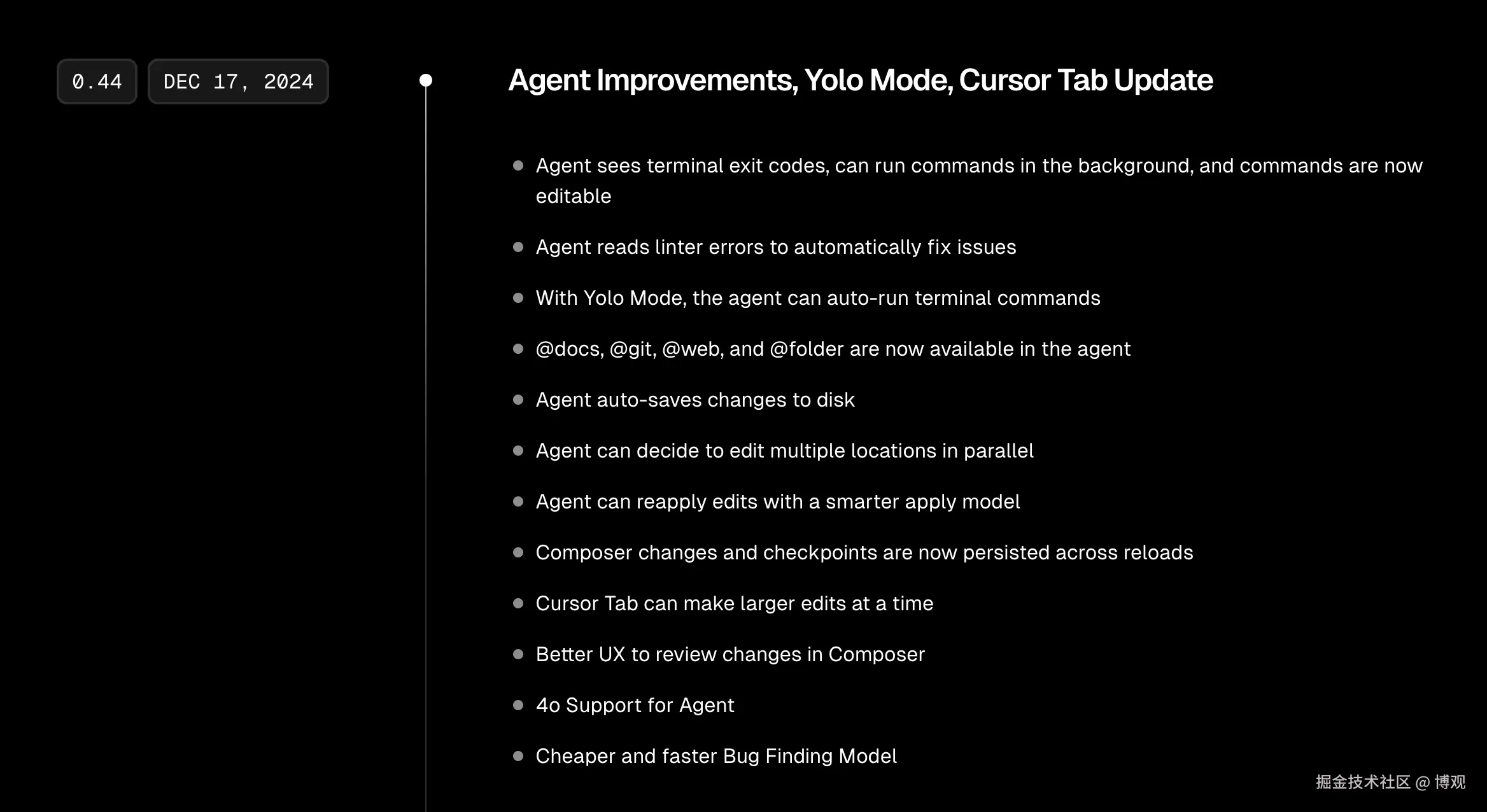 2024.12.17 Cursor 进行了一次较大的更新,大部分的更新都是和 Agent 模式相关的,总的目的就是让 Agent 模式更强大,更智能,更符合开发者的使用习惯。这也是为了和 Windsurf 直接展开竞争,毕竟 Windsurf 的 Agent 模式已经很强大了,Cursor 不能落后太多。