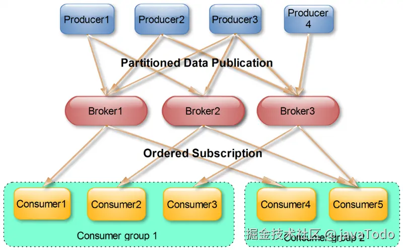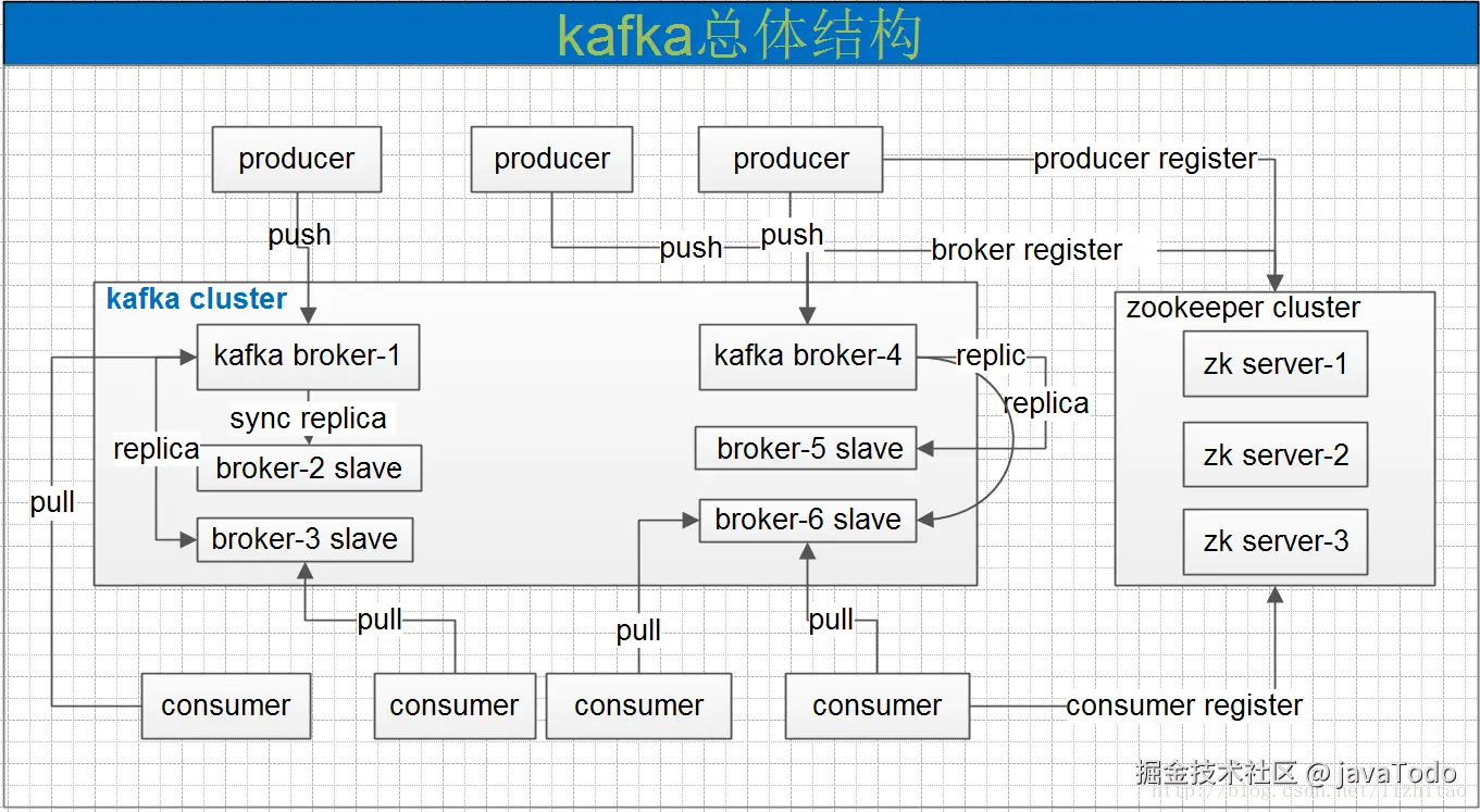 一个典型的kafka集群中包含若干producer,若干broker,若干consumer,以及一个Zookeeper集群。Kafka通过Zookeeper管理集群配置,选举leader,以及在consumer group发生变化时进行rebalance。producer使用push模式将消息发布到broker,consumer使用pull模式从broker订阅并消费消息。