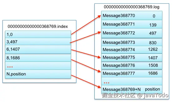 其中以索引文件中元数据3,497为例,依次在数据文件中表示第3个message(在全局partiton表示第368772个message),以及该消息的物理偏移地址为497。