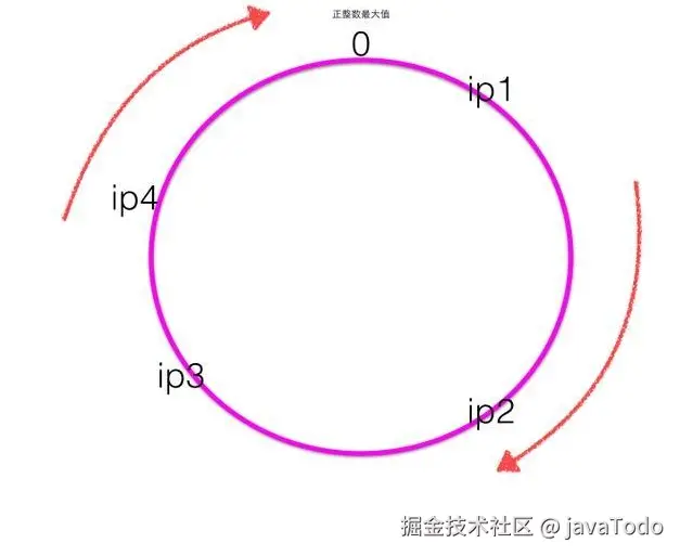 一致性hash是首先计算四个ip地址对应的hash值hash(ip1),hash(ip2),hash(ip3),hash(ip3),计算出来的hash值是0~最大正整数直接的一个值,这四个值在一致性hash环上呈现如下图: