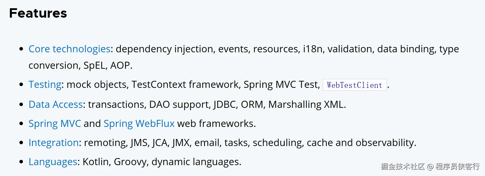 如官网介绍,Spring提供了这些核心功能: IoC、 DI(依赖注入)、AOP(面向切面编程)、数据访问、 Spring MVC、集成、测试等。