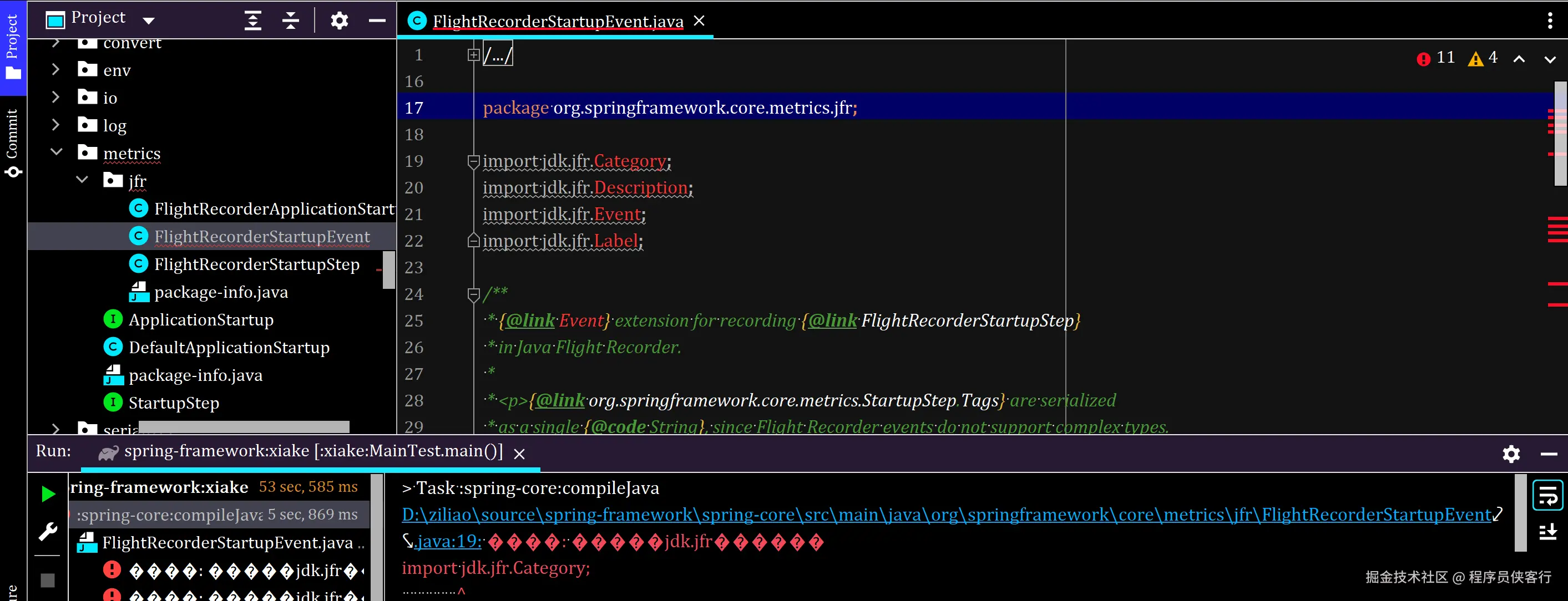 - jdk.jfr包是JDK中的性能分析和故障排查工具,不是Spring的必备代码。因此可以将FlightRecorderStartupEvent中不能引入的类注释掉,取消继承自Event类(得注释掉FlightRecorderStartupStep类中部分代码)。