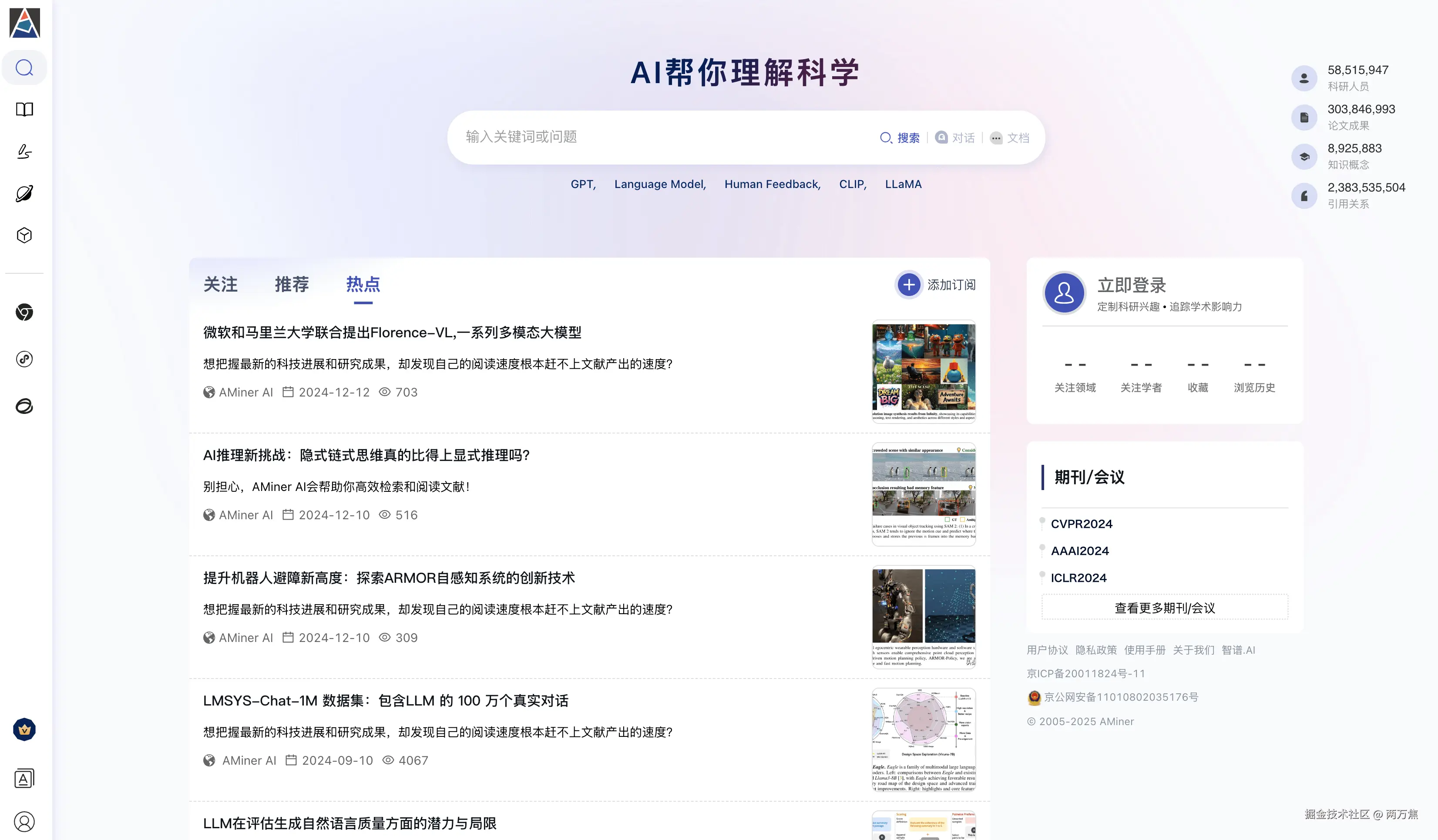 - AMiner: AI 赋能的学术检索平台,支持论文的阅读和深度解析,辅助理解论文内容