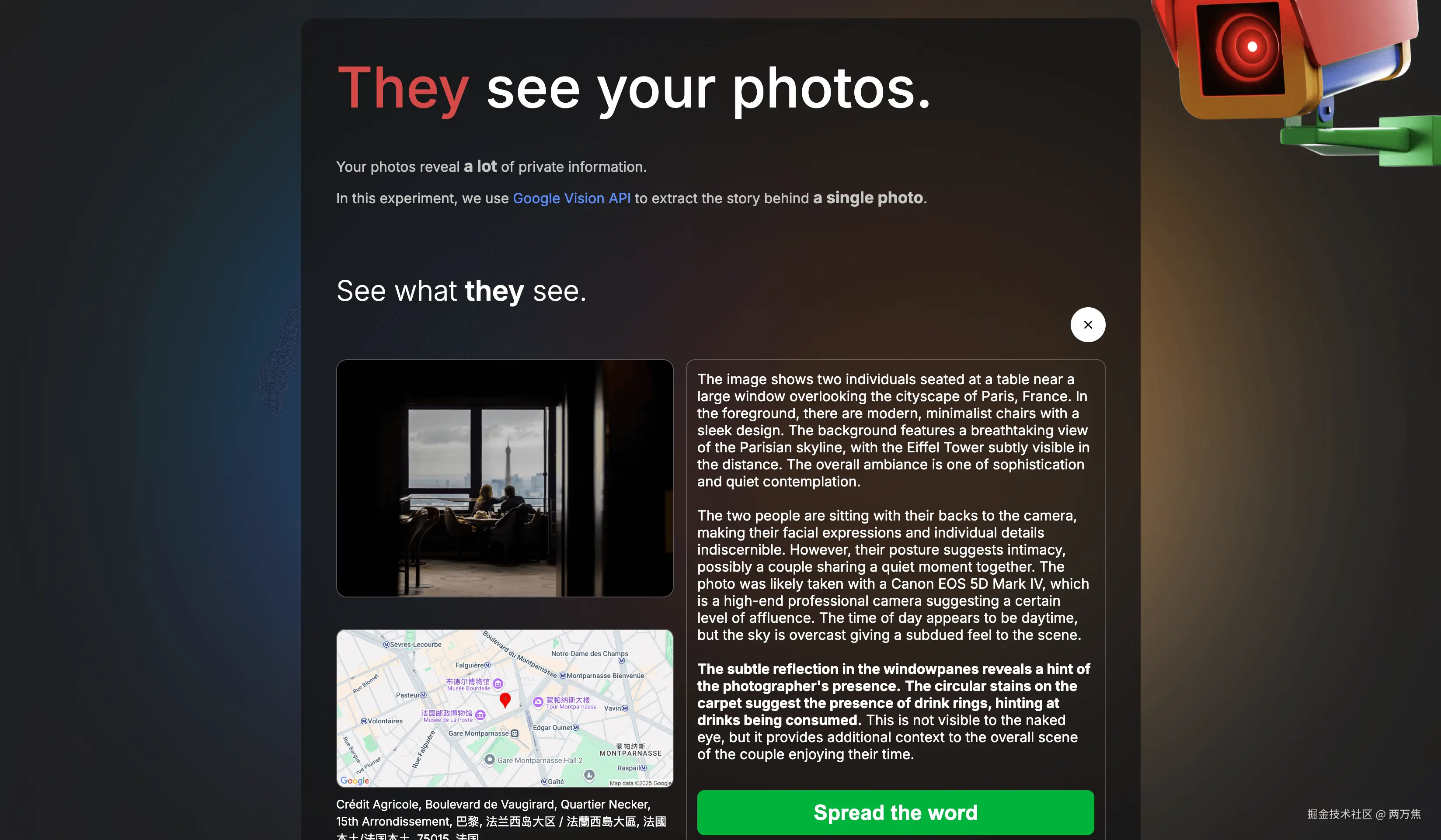- They see your photos: 通过 Google Vision API 挖掘图片中包含的信息,原来一张照片背后包含这么多信息