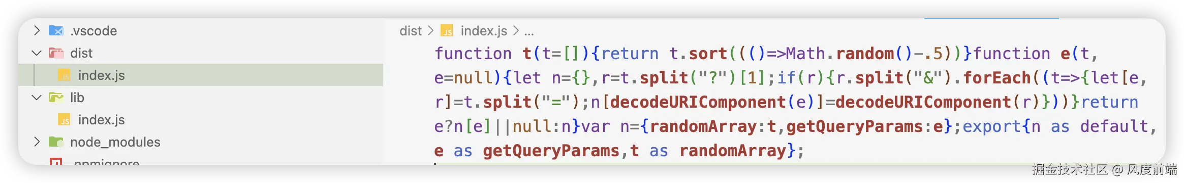 可以看到压缩后就只剩下几行代码,那么我们只需要上传这个文件到 npm 上就可以极大的减少我们的包体积,具体怎么做,请继续往下看。