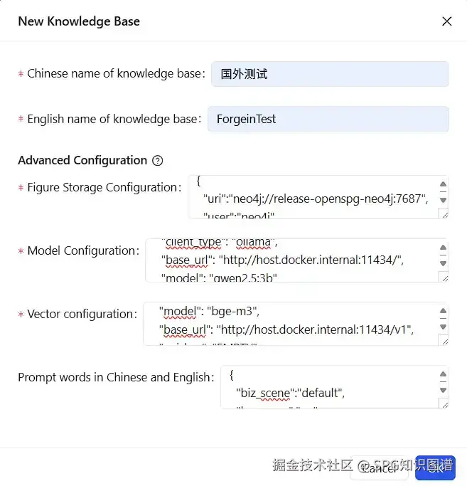 KAG 的界面让我能够为知识库命名、定义初始参数并连接之前选择的模型。这个步骤对系统开始处理我计划加载的信息至关重要。
