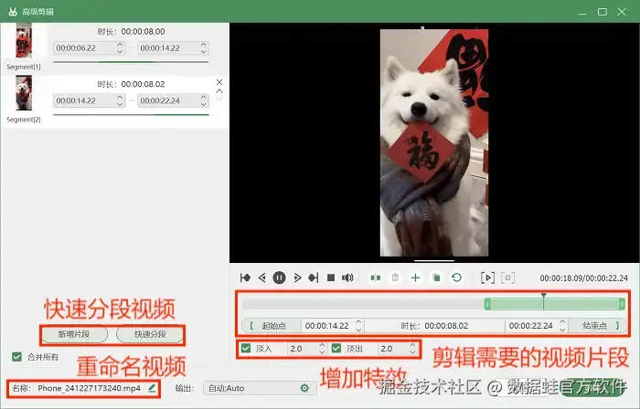 步骤4:录制完成后,可以选择进入“高级剪辑”界面。在这里面可以对视频进行快速分段、剪辑需要的片段、增加特效等操作。
